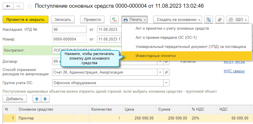 Аналогично выполняется печать в документе Принятие к учету ОС.