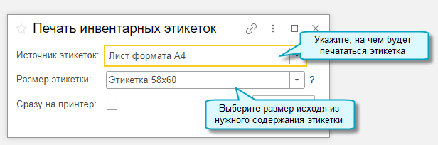 Полный интерфейс: меню "ОС и НМА - Сервис - Печать инвентарных этикеток"