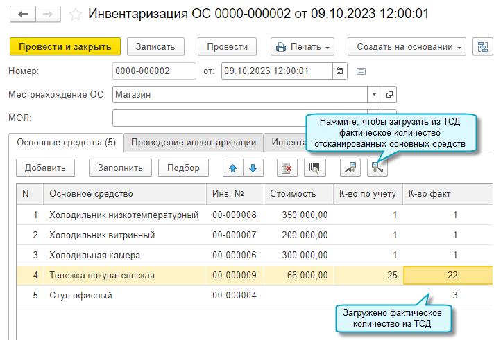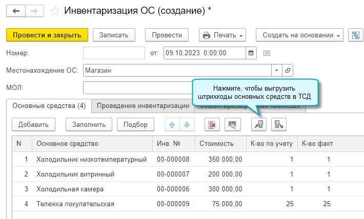 Для этого потребуется сначала распечатать и наклеить на основные средства инвентарные этикетки со штрихкодами. При инвентаризации достаточно будет отсканировать эти штрихкоды терминалом сбора данных, чтобы загрузить фактические остатки основных средств в документ Инвентаризация ОС.