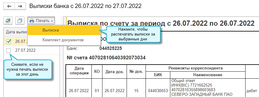 Добавлена возможность распечатать выписку Сбербанка и платежные документы по ней, загруженные через сервис 1С:ДиректБанк.