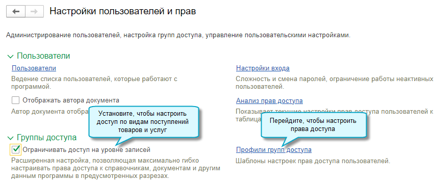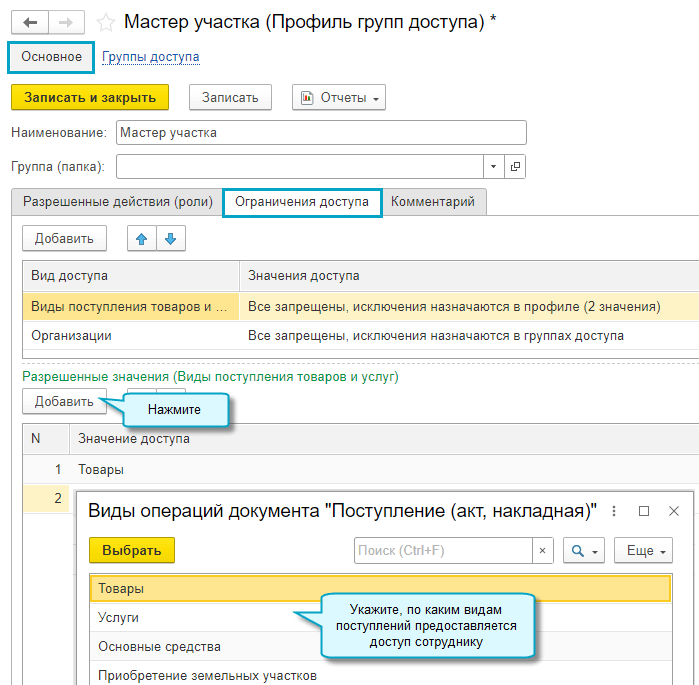 Добавлена возможность ограничить сотрудникам доступ к документам поступления по их видам. Например, предоставить права только на поступление товаров.