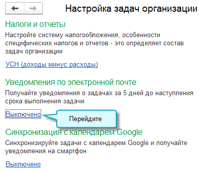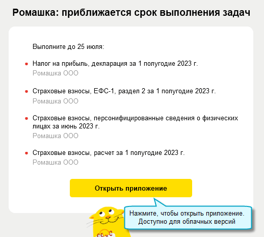 Добавлена возможность получать по электронной почте уведомления о ближайших задачах организации. За 5 дней до крайнего срока выполнения направляется письмо со списком задач организации. Это поможет не пропустить сроки тем, кто нерегулярно работает в самом приложении. Если используется облачная версия, то сразу из письма можно перейти в приложение, чтобы выполнить задачи.