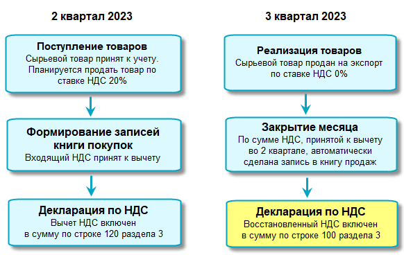 Заполняется строка 100 по товарам, относящимся к сырьевым согласно п.10 ст.165 Налогового кодекса РФ, когда восстанавливается НДС, принятый ранее к вычету.