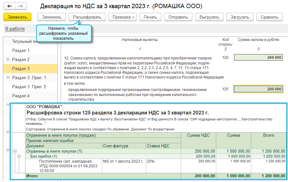 Добавлена возможность автозаполнения строки 100 «суммы налога, подлежащие восстановлению при совершении операций, облагаемых по налоговой ставке 0 процентов» и строки 125 "сумма налога, предъявленная подрядными организациями (застройщиками, техническими заказчиками) по выполненным работам при проведении капитального строительства" раздела 3 декларации по НДС.