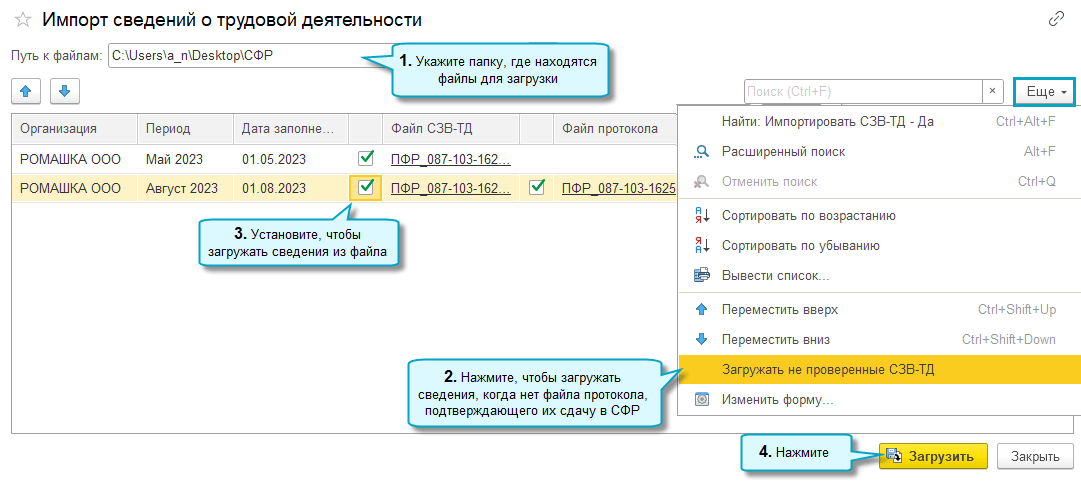Полный интерфейс: "Зарплата и кадры - Сервис - Импорт сведений о трудовой деятельности".