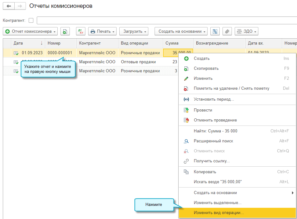 Добавлена возможность изменить вид операции отчета комиссионера с розничной продажи на оптовую или наоборот.