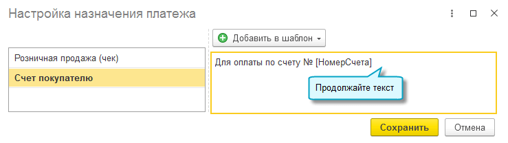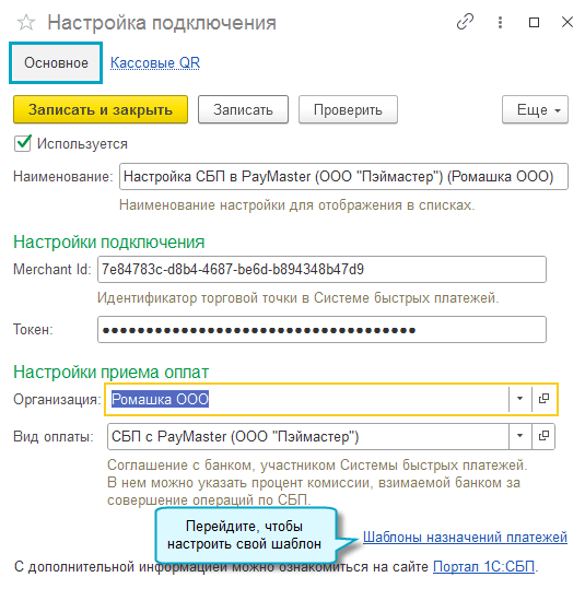 Автоматически при оплате по счету передается такое назначение - "Оплата через СБП по счету № ... от .... Сумма ...", чтобы передавать покупателю другое назначение, выполните следующие настройки: