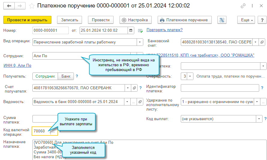 Добавлена возможность в платежном поручении заполнять код валютной операции. Его требуется указывать при выплате зарплаты сотруднику-иностранцу, не имеющему вида на жительство в РФ, временно пребывающему в РФ. Такие сотрудники признаются нерезидентами по валютному законодательству (Инструкция Банка России от 16.08.2017 № 181-И).