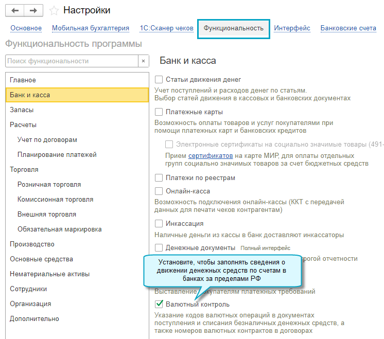 Полный интерфейс: меню "Главное - Настройки - Функциональность - Банк и касса".