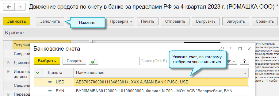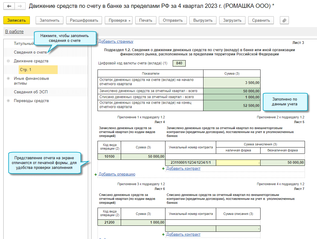 Добавлена возможность заполнить отчет о движении средств по счету в банке за пределами РФ, действующий начиная с отчетности за 4 квартал 2023 года (Постановление Правительства РФ от 14.11.2023 № 1911).