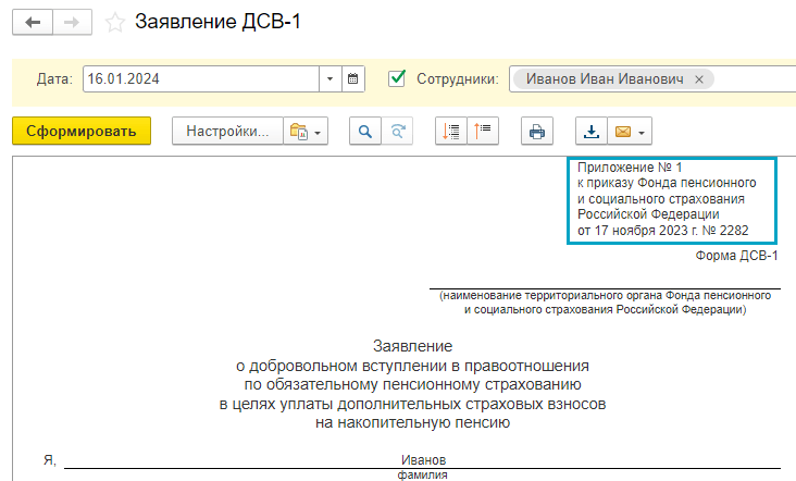 С 01.01.2024 печатается форма заявления о добровольном вступлении сотрудника в правоотношения по обязательному пенсионному страхованию в целях уплаты дополнительных страховых взносов на накопительную пенсию (форма ДСВ-1), утвержденная Приказом СФР от 17.11.2023 № 2282.