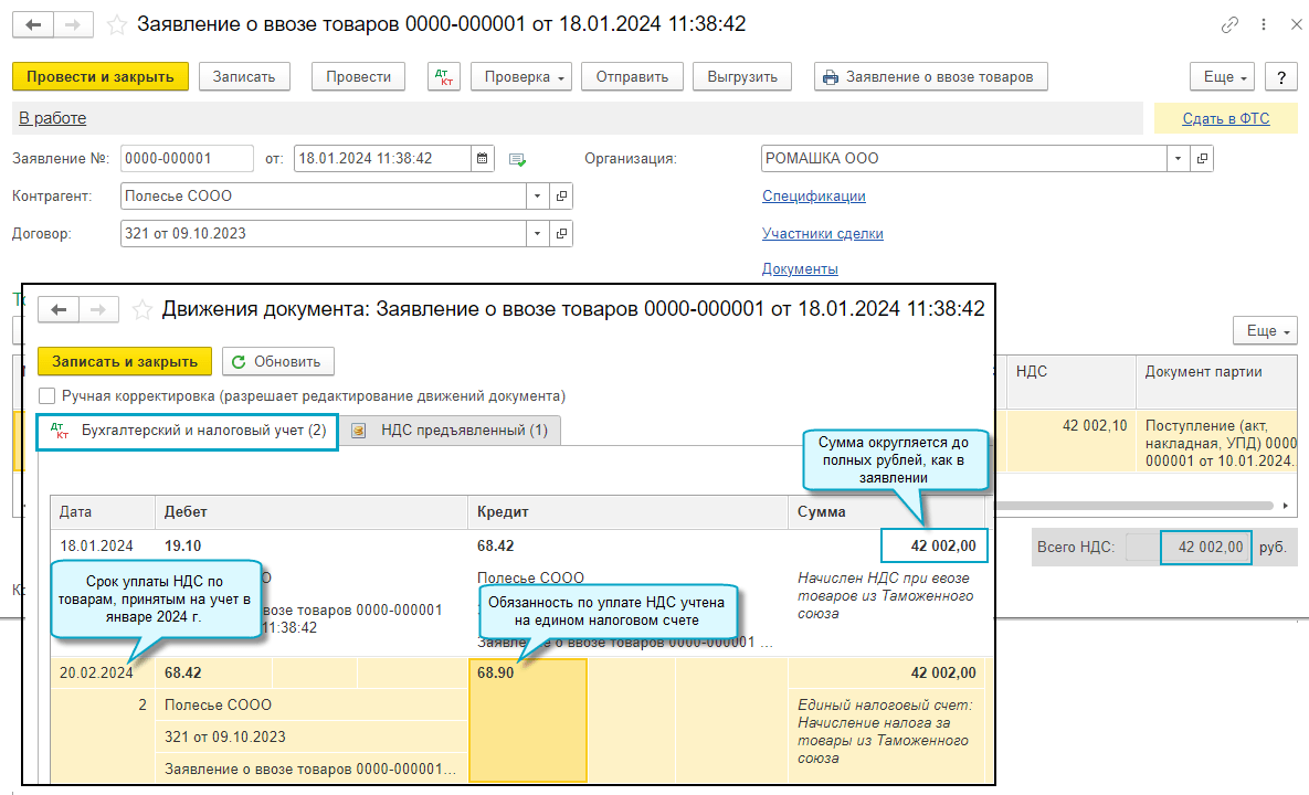НДС, уплачиваемый при ввозе товаров из ЕАЭС, теперь автоматически начисляется на счет 68.90 "Единый налоговый счет" при подготовке заявления о ввозе товаров.