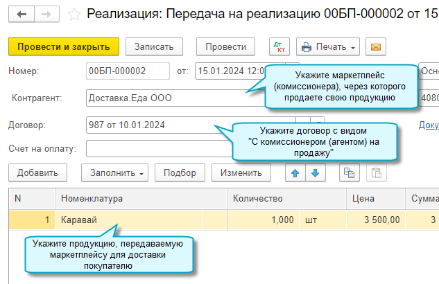Полный интерфейс: меню "Продажи - Продажи - Маркетплейсы и комиссионеры - Передача на реализацию".