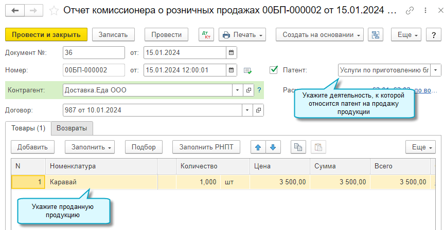 Аналогично указывается патент в Отчете о продажах (оптовые продажи).