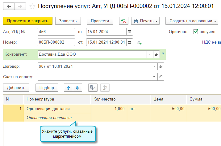 Полный интерфейс: меню "Продажи - Продажи - Маркетплейсы и комиссионеры - Поступление услуг (акт, УПД)".