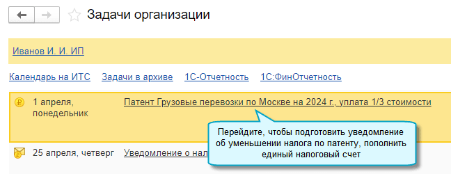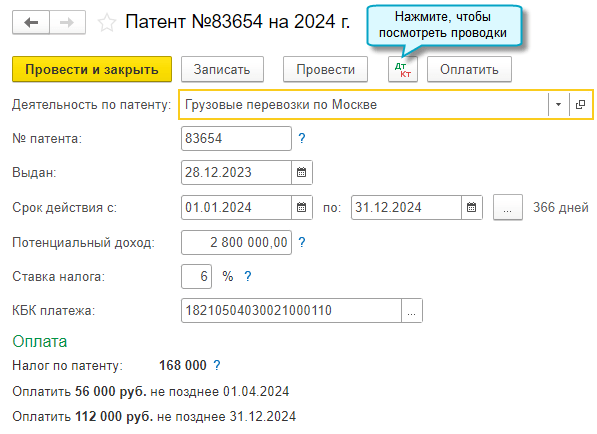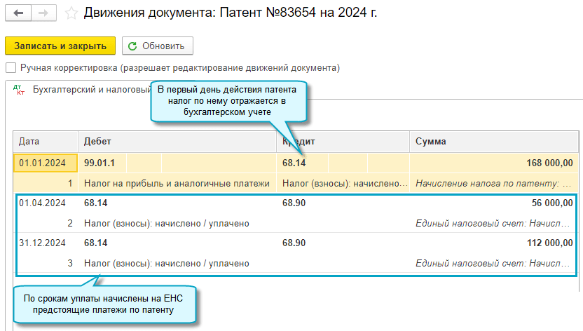 Для начисления налога по патенту на ЕНС достаточно сделать запись о патенте.