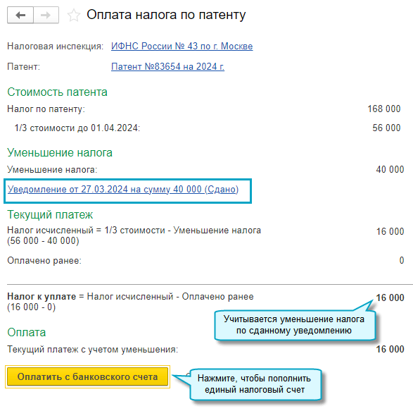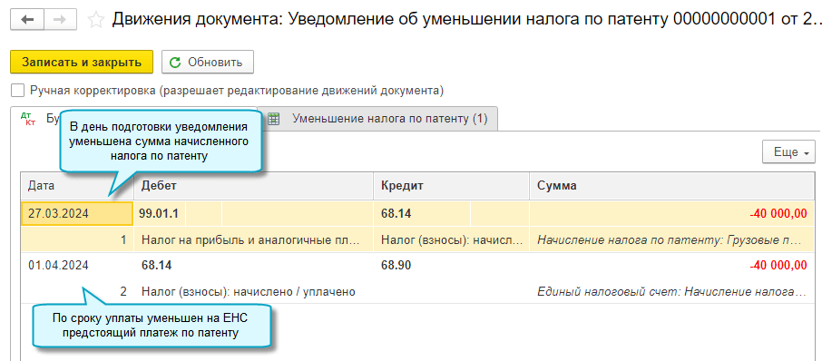 Уменьшение учитывается на ЕНС датой уведомления, когда уменьшается сумма налога по патенту за прошлый год.