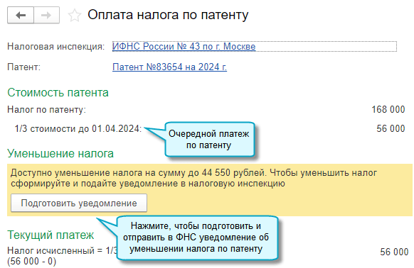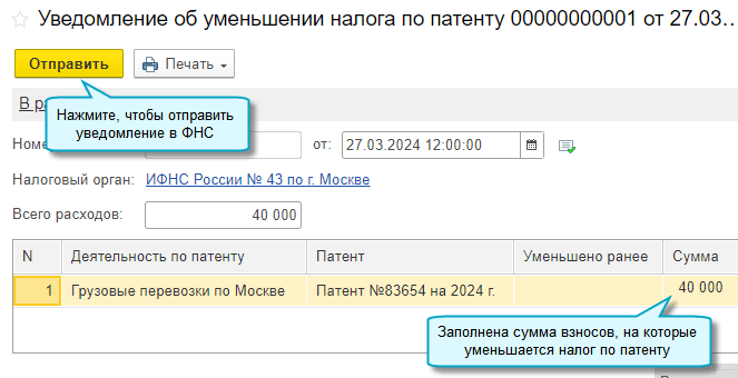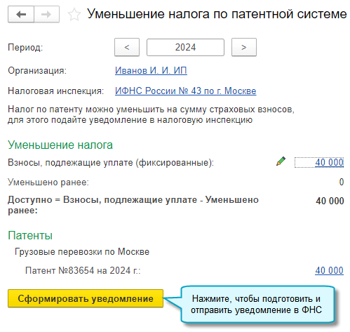 Для уменьшения начисленного налога и предстоящих платежей достаточно отправить в ФНС уведомление об уменьшении налога по патенту. Сумма взносов, для уменьшения налога рассчитается автоматически, при необходимости ее можно скорректировать.