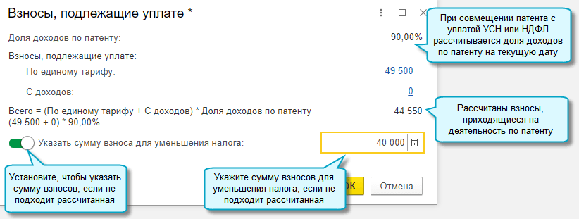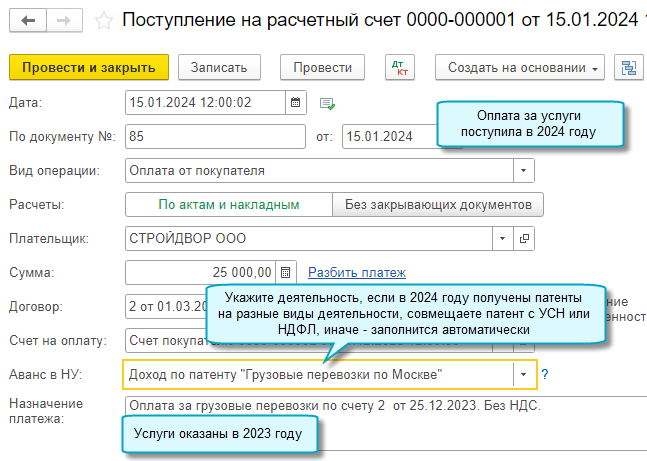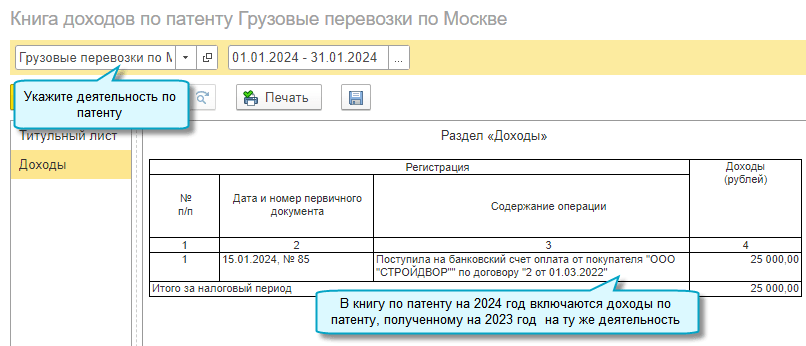 Такая возможность понадобится, когда услуги оказываются в периоде деятельности по одному патенту, а оплата поступает в периоде такой же деятельности по другому патенту. Она упрощает ведение книги доходов по патенту.