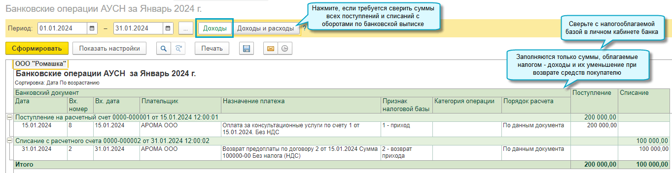 Организациям, применяющим АУСН с объектом "доходы", теперь удобнее сверять свои доходы с разметкой в личном кабинете банка. Для них добавлен специальный вариант отчета "Банковские операции АУСН". В него включаются только доходы, облагаемые налогом.