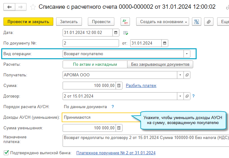 Используйте вид операции "Возврат покупателю", когда при списании средств с расчетного счета требуется уменьшить доходы, например, при возврате аванса покупателю.