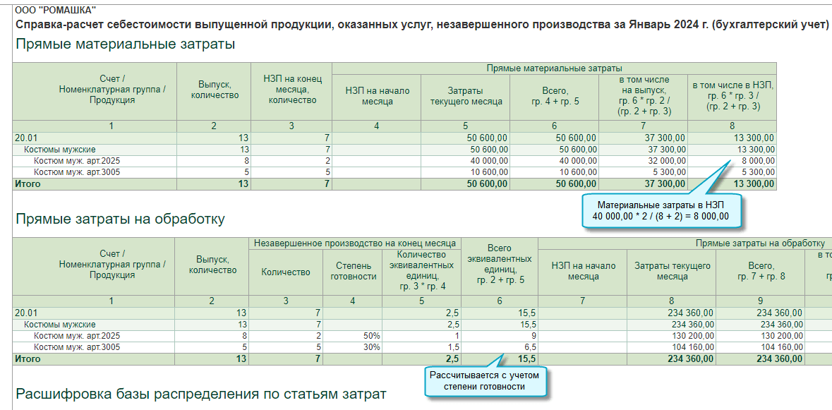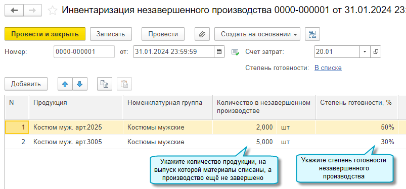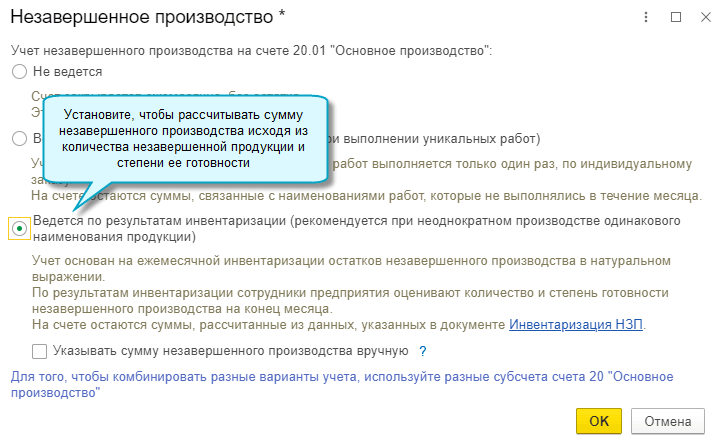 Для автоматического расчета стоимости НЗП потребуется ежемесячно проводить инвентаризацию продукции, прошедшей только часть стадий обработки - незавершенного производства. И регистрировать количество и степень готовности такой продукции.