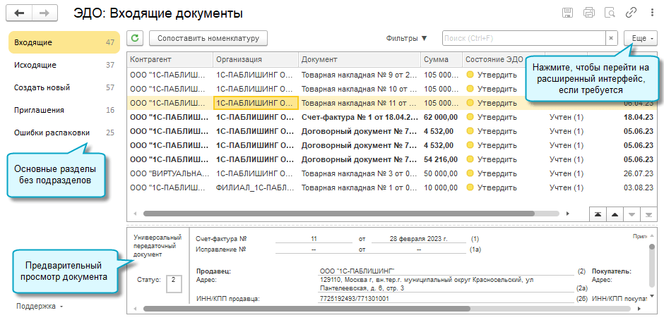 Добавлена возможность перейти на легкий интерфейс ЭДО. Он рекомендуется, когда документы отправляются, получаются, подписываются и отражаются в учете без дополнительных действий. Если же документы часто исправляются, много запросов на уточнение, аннулирование, то используйте привычный расширенный интерфейс. Подробнее...