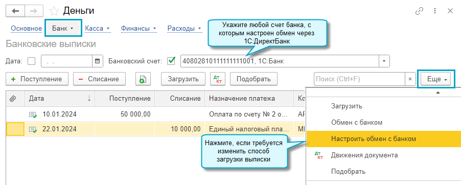 Чтобы изменить выбранный способ загрузки выписки, потребуется выполнить следующую настройку: