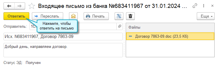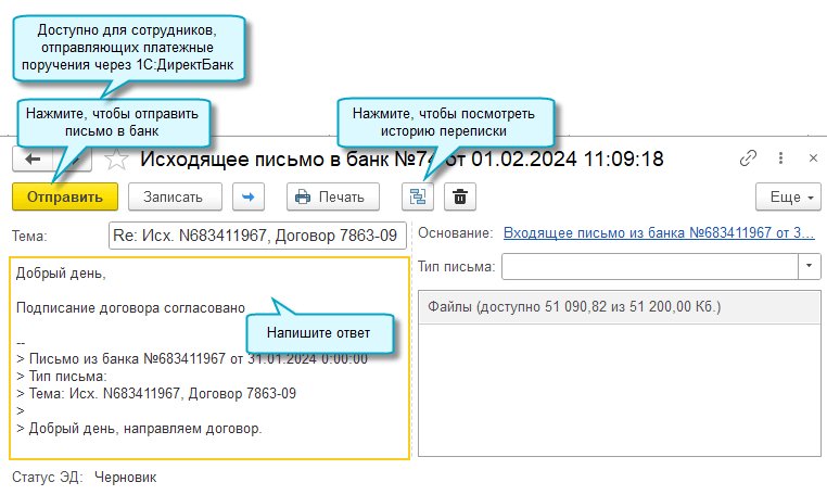 Просматривать переписку могут все бухгалтеры, но ответы в банк отправляют только те сотрудники, кто подписывает и отправляет платежные поручения через 1С:ДиректБанк.