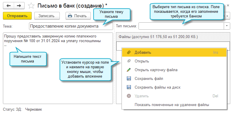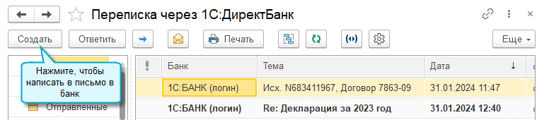 Теперь удобнее вести переписку с банками, с которыми настроен обмен через 1С:ДиректБанк. Входящие и исходящие письма собраны в одном разделе, приходят оповещения о новых письмах из банка. Новые письма поступают из банка одновременно с загрузкой банковской выписки. Такая работа с письмами доступна, когда банк поддерживает возможность переписки на своей стороне.