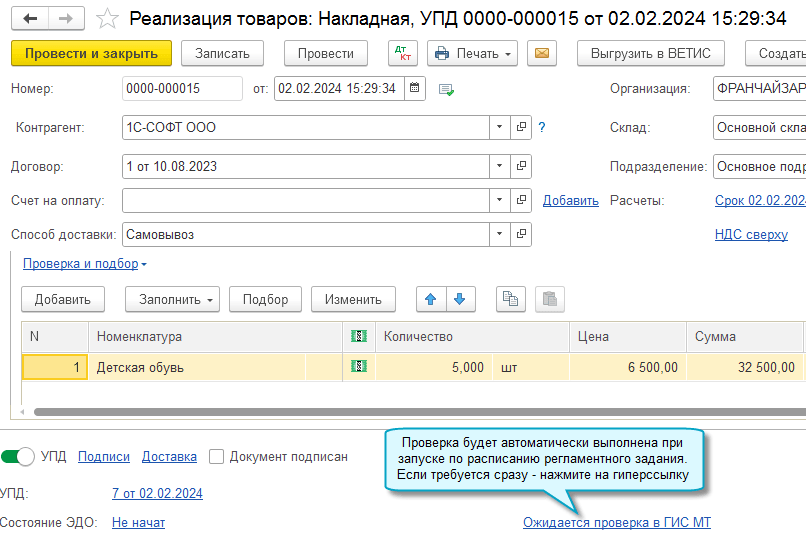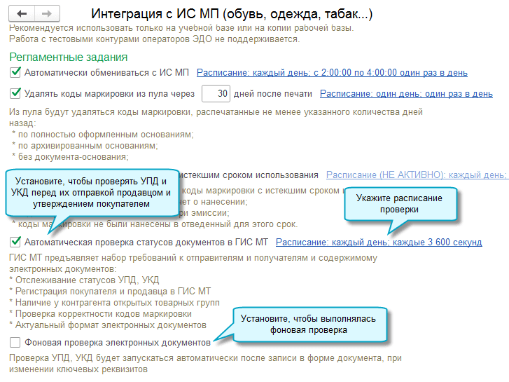 Добавлена возможность автоматической проверки статусов универсальных передаточных документов (УПД) и универсальных корректировочных документов (УКД) в ГИС МТ "Честный знак" перед их отправкой на стороне продавца и утверждением на стороне покупателя. Это помогает выявить ошибки на этапе оформления документов.