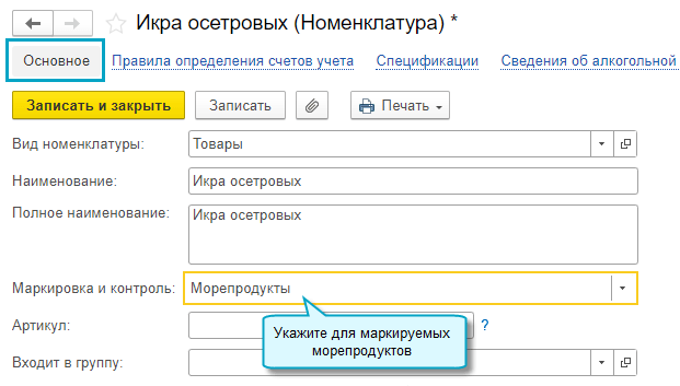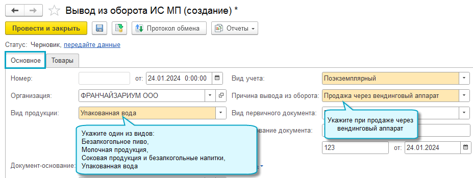 Для морепродуктов также предусмотрено отражение операций: вывод из оборота, возврат в оборот, списание кода маркировки.
