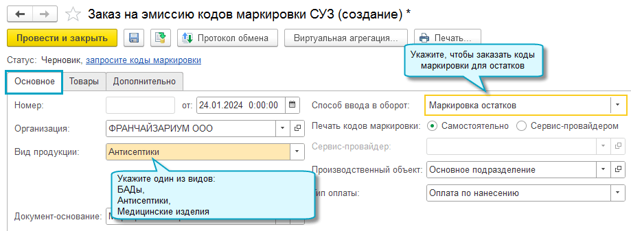 При заказе кодов маркировки указывается способ ввода в оборот: произведен в РФ, ввезен в РФ.