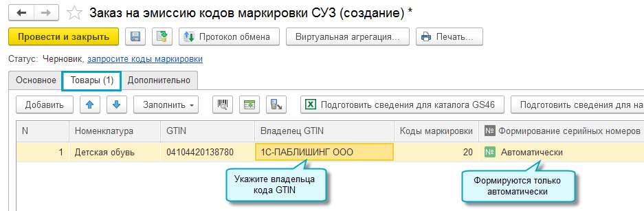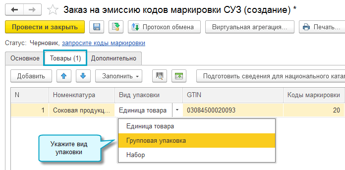 Заказ кодов маркировки доступен для единицы продукции (индивидуальная упаковка) и групповой упаковки, наборы не предусмотрены. При оформлении документа "Заказ на эмиссию кодов маркировки СУЗ" в таблице Товары в графе Вид упаковки можно выбрать стандартный или укороченный код маркировки товара или упаковки.