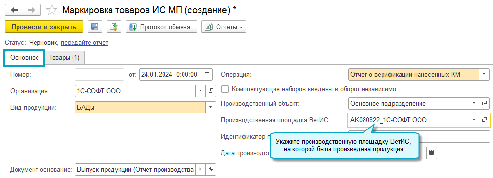 2. в документах Маркировка товаров ИС МП указывать производственный объект.
