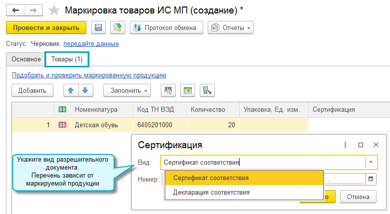 Обновлены виды разрешительной документации, используемые при заполнении данных о сертификации. Перечень доступных видов зависит от маркируемой продукции.