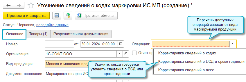 Для этого в документ "Уточнение сведений о кодах маркировки ИС МП" добавлены виды операций: