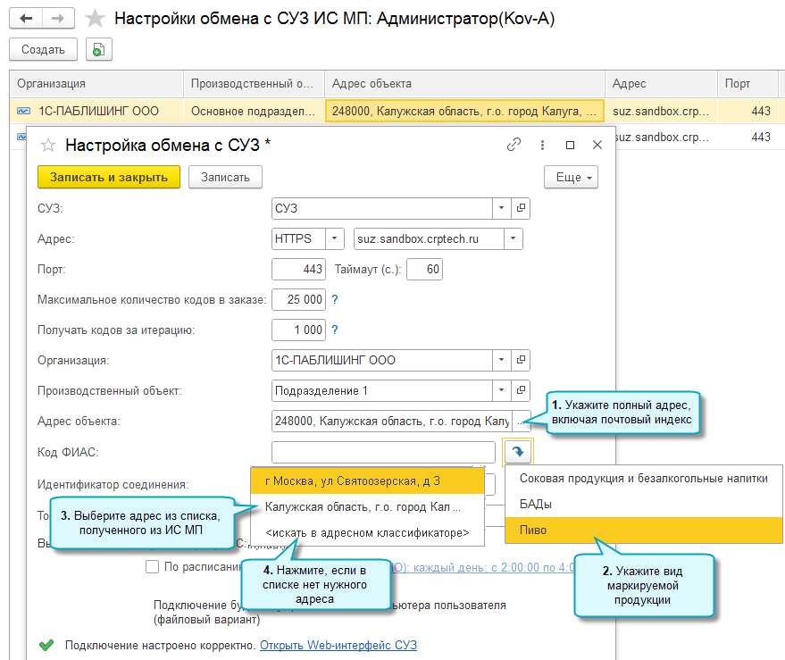 1. указать код ФИАС в настройках обмена с СУЗ,