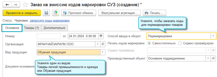 Добавлена возможность заказать коды маркировки и выполнить перемаркировку для организаций, не являющихся производителями или импортерами товара - владельцами кода GTIN. Такая возможность предусмотрена для товарных групп: Товары легкой промышленности и одежда, Обувная продукция. Эта возможность пригодится для оптовых или розничных продавцов.