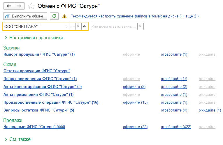 Добавлено рабочее место Обмен с ФГИС "Сатурн". Здесь собраны все документы ФГИС "Сатурн", задачи по их оформлению.