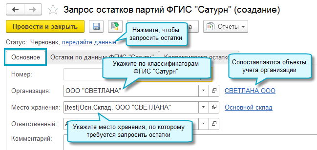 Загрузка остатков партий выполняется по организации и месту хранения по классификаторам ФГИС "Сатурн". Если не указать место хранения, из ФГИС "Сатурн" будут загружены остатки партий по всем местам хранения.