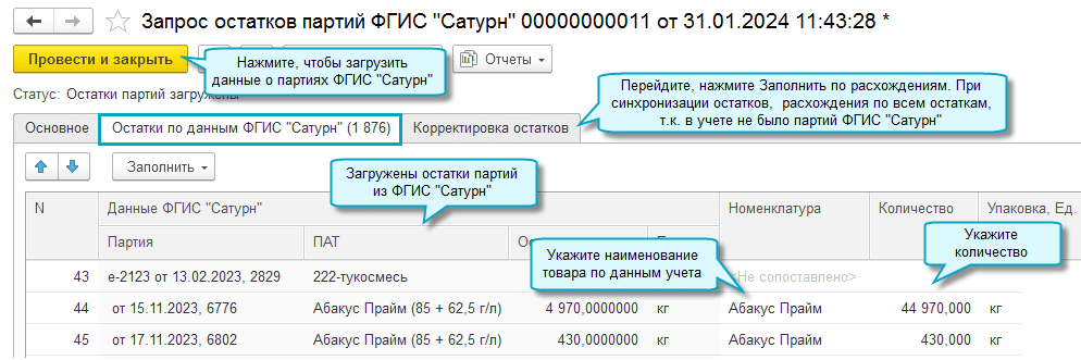 Учет в ФГИС "Сатурн" ведется по партиям. По каждой партии отслеживается ее количество, местоположение, собственник и действия, которые приводят к их изменениям.