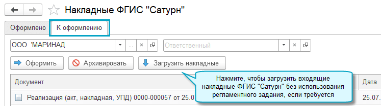 Для загрузки входящих накладных ФГИС "Сатурн" рекомендуется настроить регламентное задание. При необходимости загрузку можно выполнить вручную.