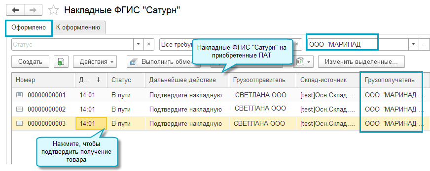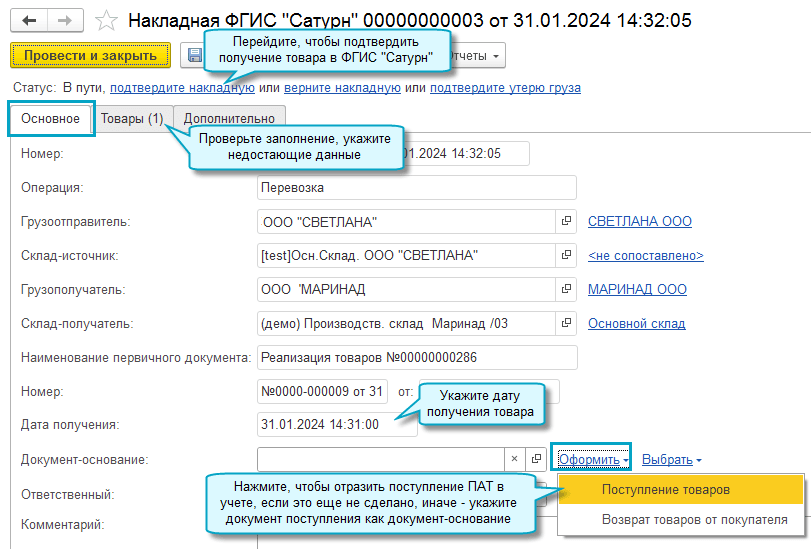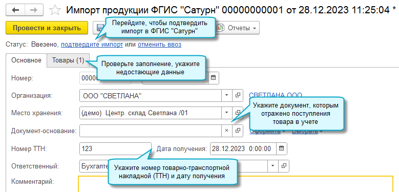 При импорте ПАТ требуется подтвердить получение товара в загруженном документе Импорт продукции ФГИС "Сатурн".