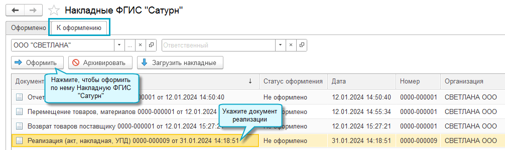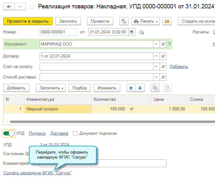 Создавайте Накладную ФГИС "Сатурн" при оформлении документа реализации, переходя по ссылке внизу формы, если сразу при продаже передаете данные.