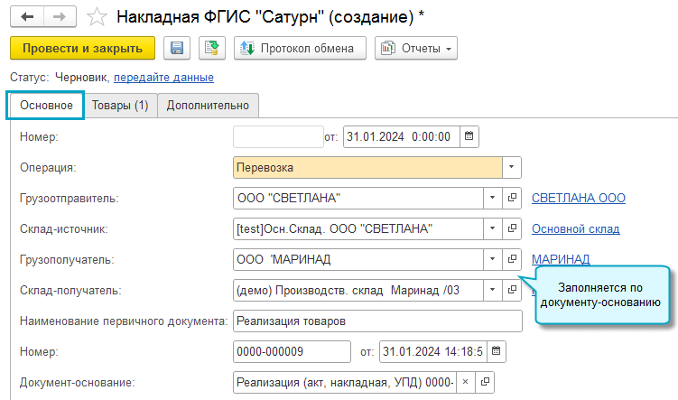 Исходящие документы ФГИС "Сатурн" можно также создавать при оформлении первичного учетного документа. Например, оформить Накладную ФГИС "Сатурн" из документа реализации.