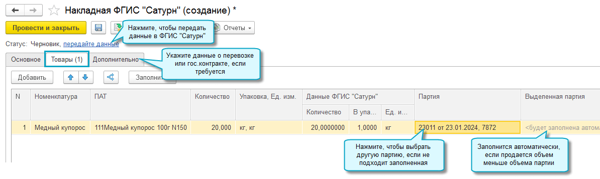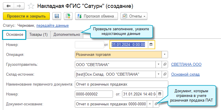 Используйте документ Накладная ФГИС "Сатурн" с операцией Перевозка, чтобы передать в ФГИС «Сатурн» данные об оптовых продажах ПАТ.