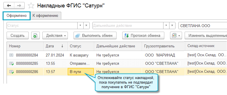Полный интерфейс: меню "Администрирование - Сервис - Обмен с ФГИС "Сатурн" - Продажи - Накладные ФГИС "Сатурн".