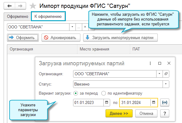 Для загрузки из ФГИС "Сатурн" данных об импортируемых партиях ПАТ рекомендуется настроить регламентное задание. При необходимости загрузку можно выполнить вручную.