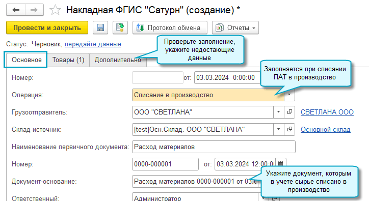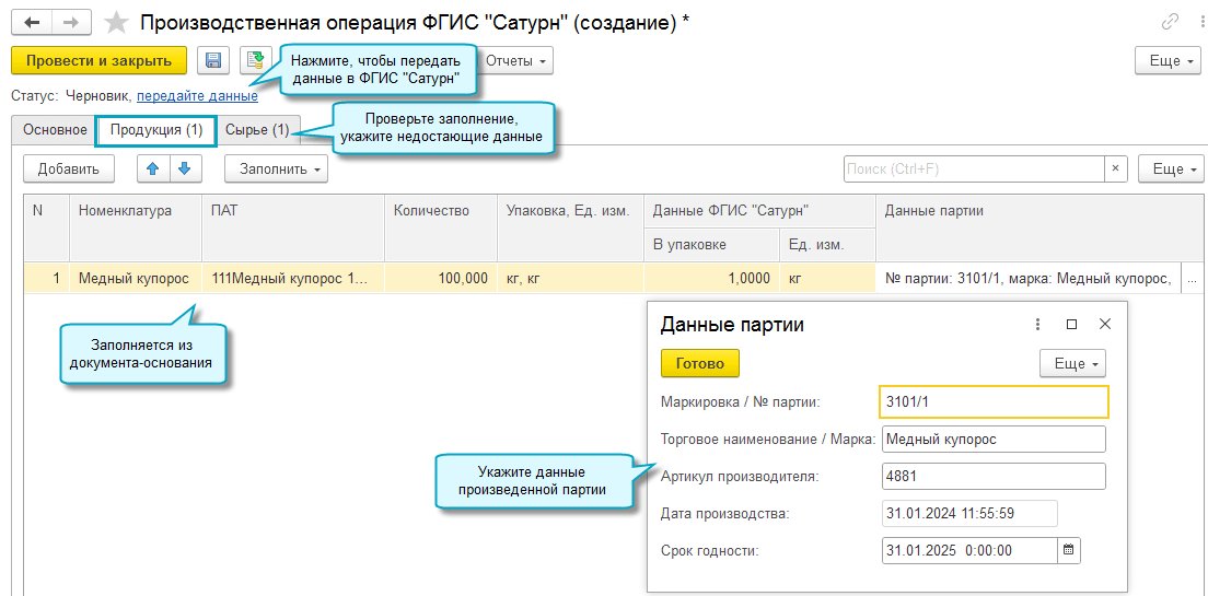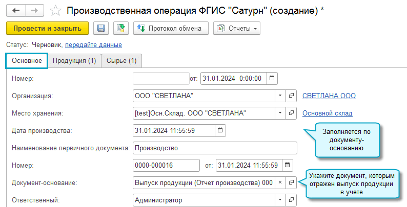 Используйте документ Производственная операция ФГИС "Сатурн", чтобы передать данные о производстве ПАТ.